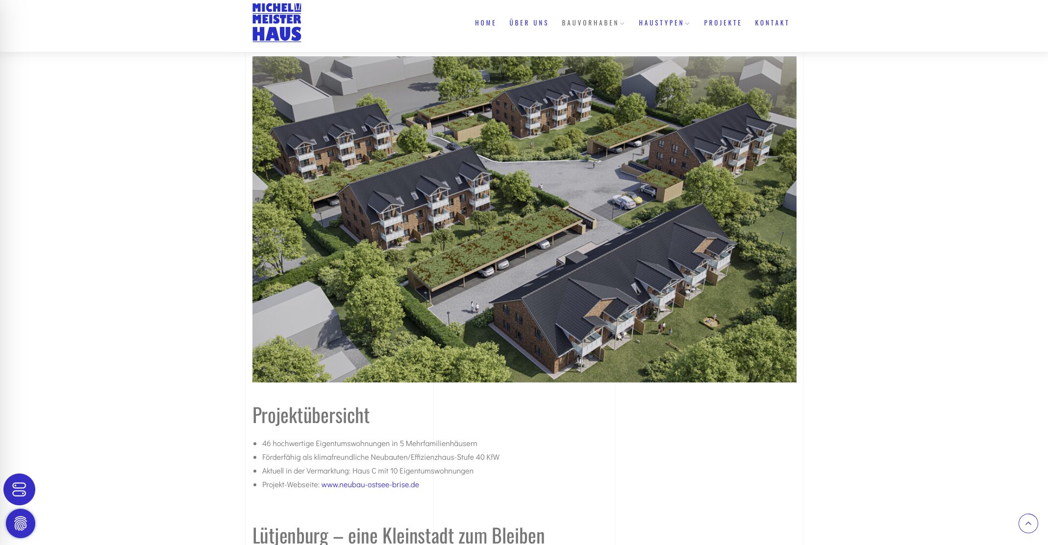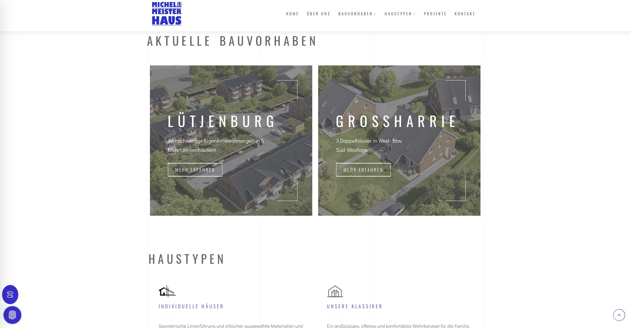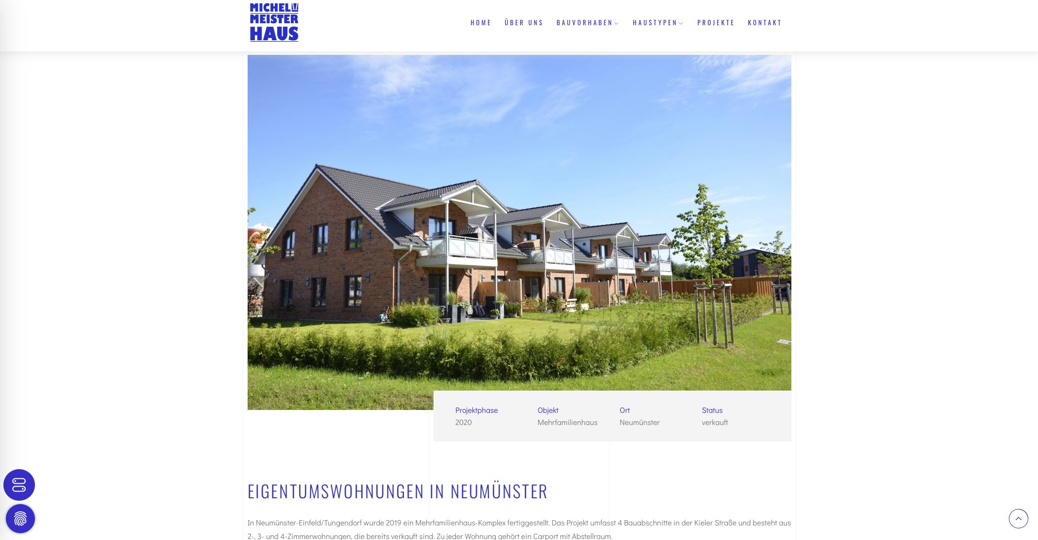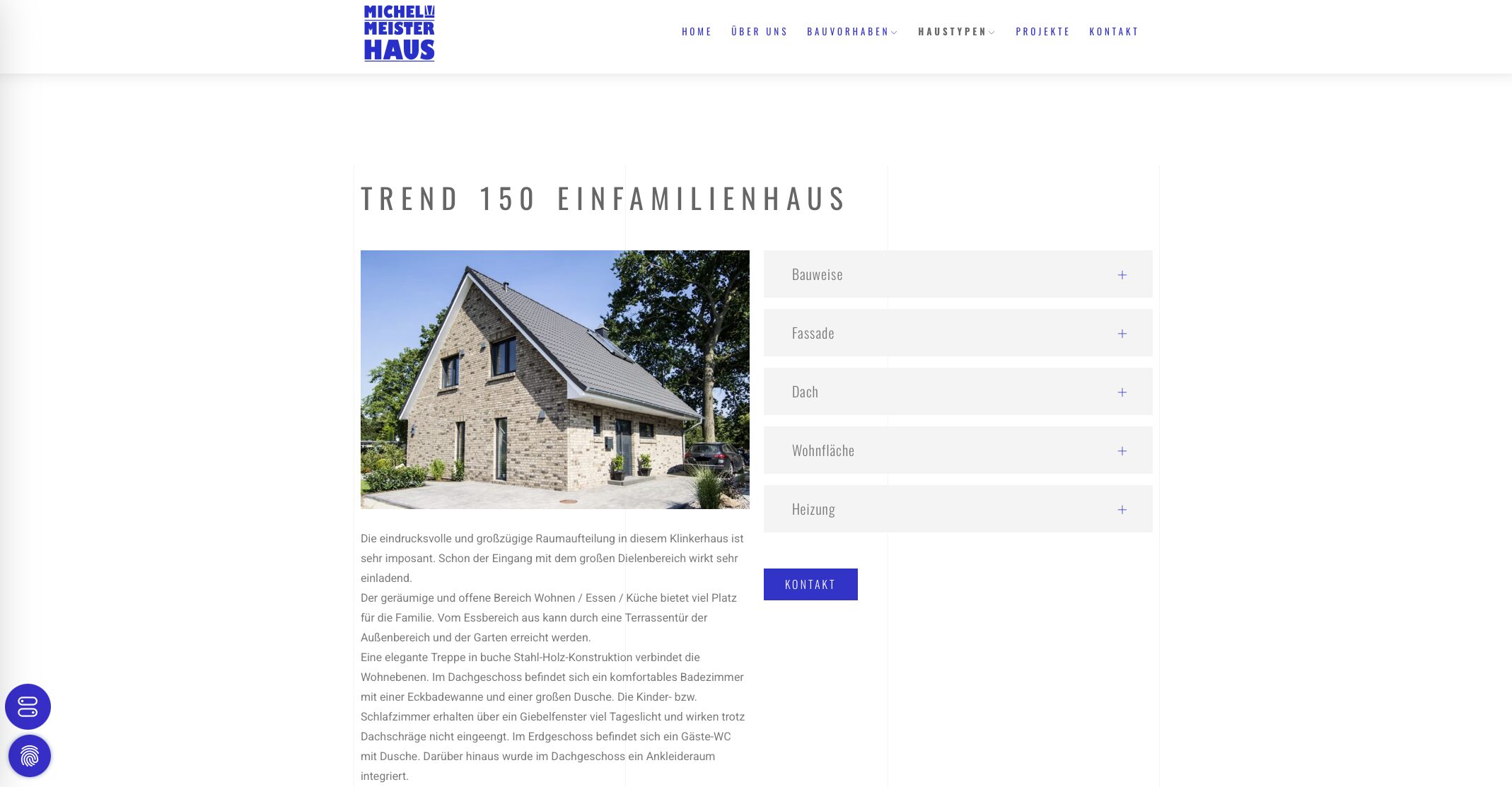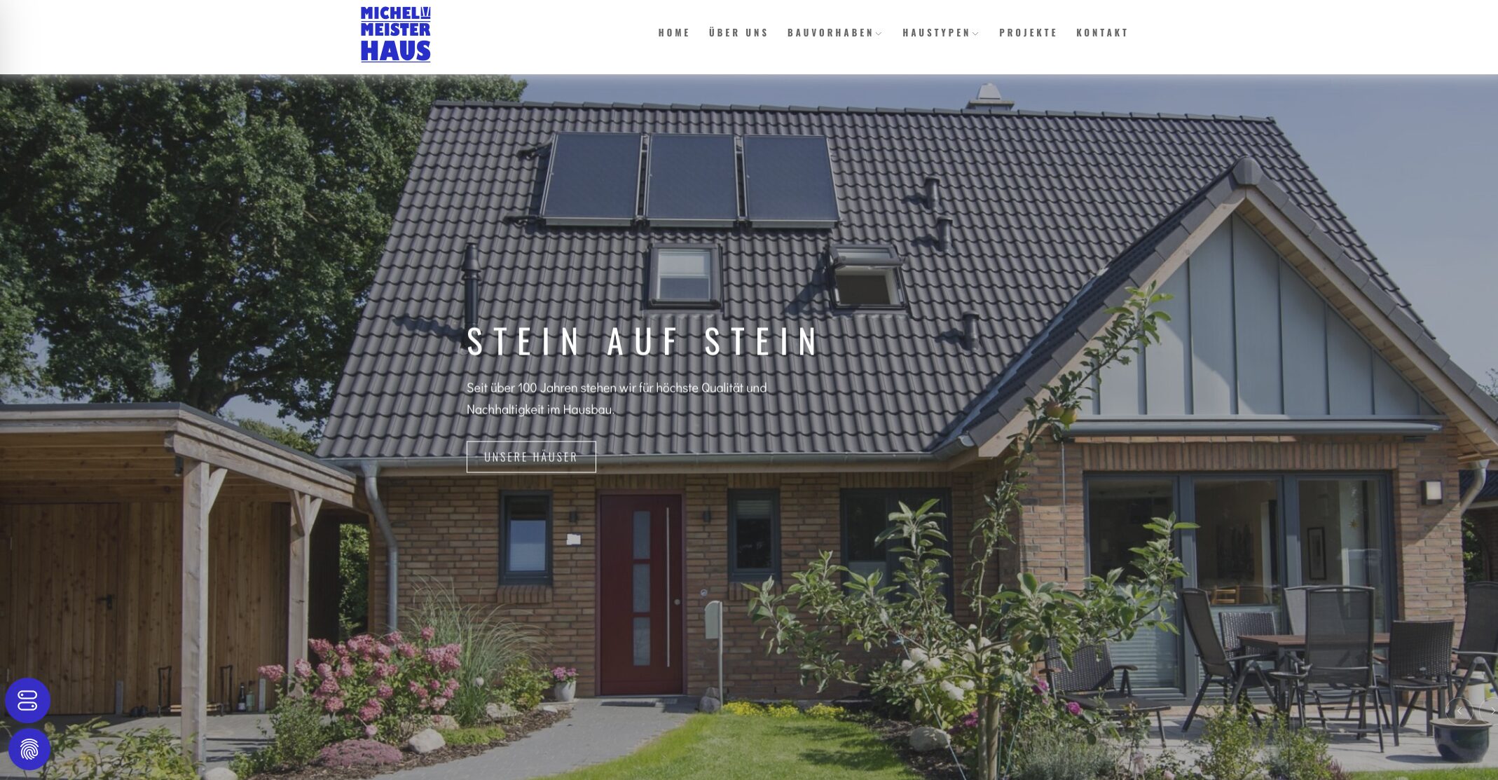 Das Webdesign unterstützt mit großflächigen Bildern an markanten Stellen den ersten Eindruck vom Portfolio, das Michel Meisterhaus im Bereich Immobilienbau anbietet. Eine Übersicht zu bereits abgeschlossenen Projekten sowie erste Detailangaben zu den Produkten ergänzen das Angebot.